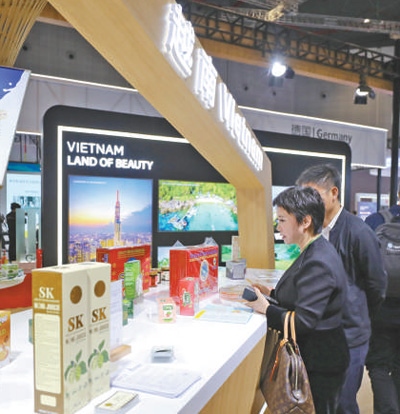 11月6日,參觀者在第六屆進(jìn)博會國家展越南展臺挑選商品。新華社記者 李夢嬌攝