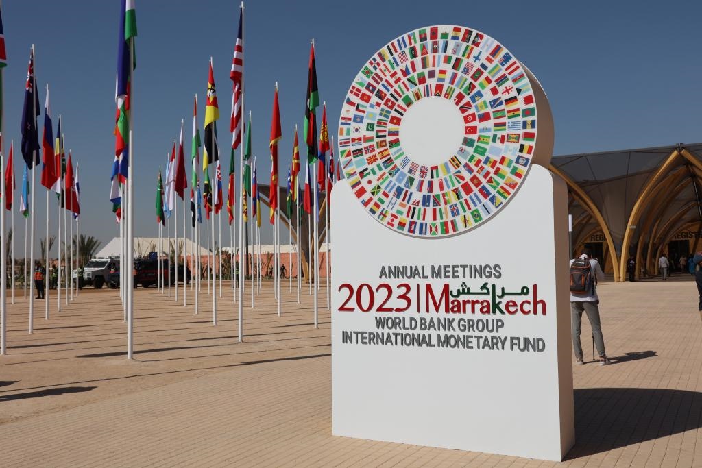 這是2023年10月9日在摩洛哥馬拉喀什拍攝的國際貨幣基金組織(IMF)和世界銀行年會(huì)標(biāo)志。新華社記者霍晶攝