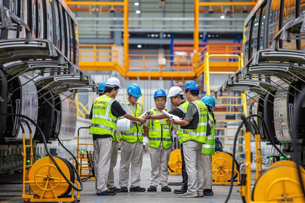 2023年9月22日,在泰國曼谷“黃線”列車維護(hù)中心,中車浦鎮(zhèn)阿爾斯通運(yùn)輸系統(tǒng)有限公司工作人員檢修列車。新華社記者王騰攝