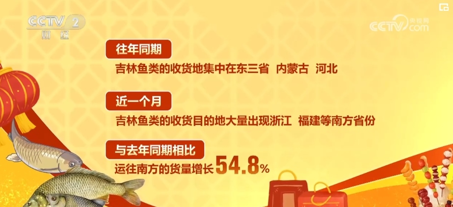 南方水果運往北方的同時,北方的堅果、水產(chǎn)和鮮奶運送到了南方。從訂單數(shù)據(jù)看,吉林魚類的收貨地在往年都集中在東三省、內(nèi)蒙古、河北。然而在最近一個月,收貨的目的地大量出現(xiàn)了浙江、福建等南方省份,跟2023年同期相比,運往南方的貨量增長了54.8%。