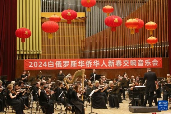 2月2日晚,2024“溫暖迎春·共慶中國(guó)年”白俄羅斯華僑華人新春交響音樂(lè)會(huì)在白俄羅斯明斯克的白俄羅斯國(guó)家音樂(lè)廳舉辦。這是來(lái)自白俄羅斯的音樂(lè)家在音樂(lè)會(huì)上演奏。新華社發(fā)(任科夫攝)