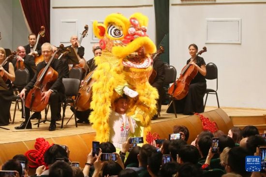 2月2日晚,2024“溫暖迎春·共慶中國(guó)年”白俄羅斯華僑華人新春交響音樂(lè)會(huì)在白俄羅斯明斯克的白俄羅斯國(guó)家音樂(lè)廳舉辦。這是音樂(lè)會(huì)上的中國(guó)傳統(tǒng)舞獅表演。新華社發(fā)(任科夫攝)