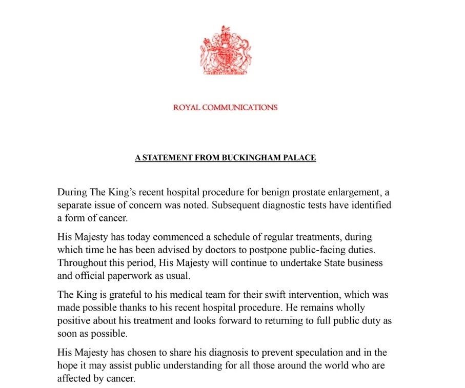 當(dāng)?shù)貢r(shí)間2月5日,白金漢宮發(fā)布消息稱,英國(guó)國(guó)王查爾斯三世在醫(yī)院的診斷檢查中被確診患有癌癥。
