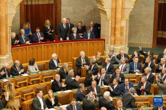 2月26日,在匈牙利布達佩斯,匈牙利當選總統(tǒng)舒尤克·道馬什(后中)接受祝賀。新華社發(fā)(弗爾季·奧蒂洛攝)