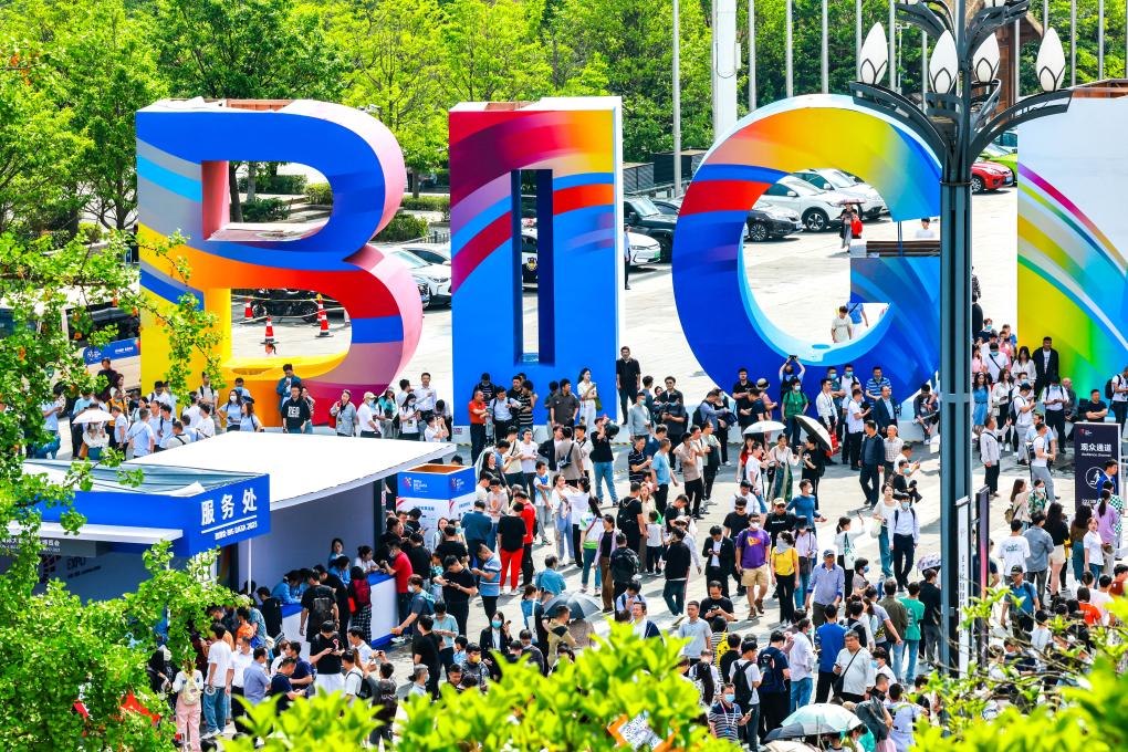 ?2023年5月26日,參會(huì)者從中國(guó)國(guó)際大數(shù)據(jù)產(chǎn)業(yè)博覽會(huì)展館外的大數(shù)據(jù)標(biāo)識(shí)前經(jīng)過(guò)。新華社記者歐東衢攝