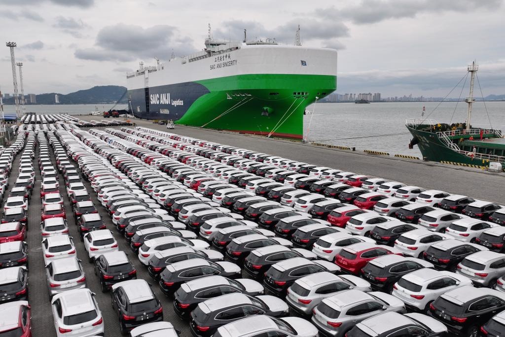 1月23日,“上汽安吉申誠(chéng)”號(hào)汽車(chē)滾裝船??吭诟=◤B門(mén)東渡港區(qū)現(xiàn)代碼頭(無(wú)人機(jī)照片)。新華社記者姜克紅攝