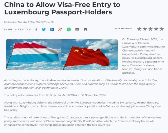 近日,中國(guó)政府決定自2024年3月14日0時(shí)起至2024年11月30日24時(shí),對(duì)包括盧森堡在內(nèi)的6國(guó)持普通護(hù)照人員實(shí)行部分免簽。中國(guó)駐盧使館及時(shí)向盧外交部等部門(mén)和主流媒體作了通報(bào),盧政府和媒體對(duì)中方免簽政策予以高度評(píng)價(jià)。