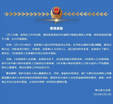 ·四川營山通報一女生遭同學毆打:9名侵害人全部到案。