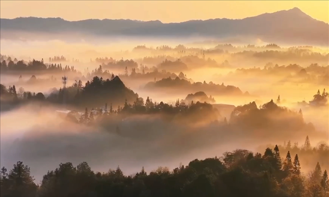 近日,在烏蒙山深處的云南省鹽津縣出現日出云海景觀。輕紗薄霧彌漫于山巒之間,宛如一幅日出版《千里江山圖》。