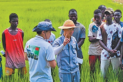 中國農(nóng)業(yè)專家在試驗(yàn)田記錄數(shù)據(jù)。于青攝