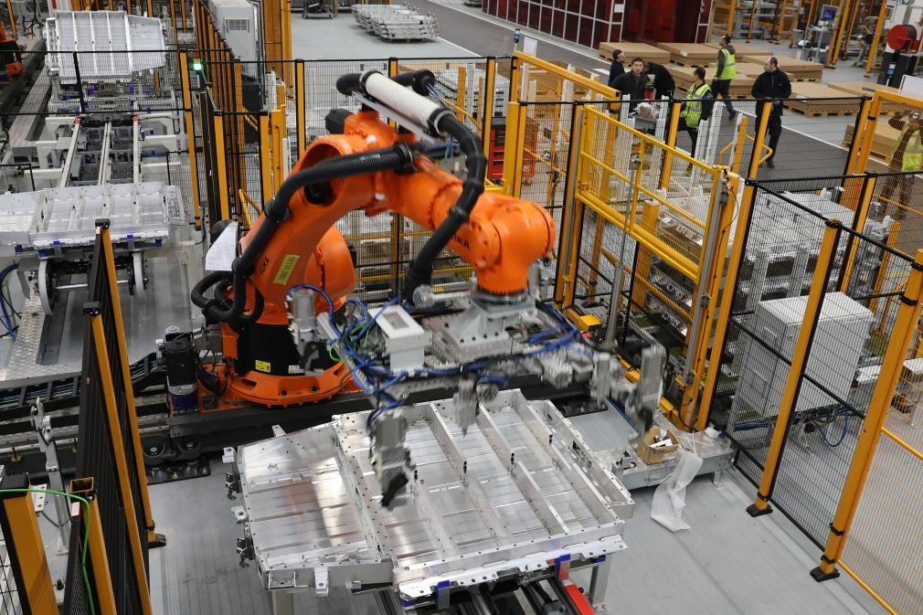 2月23日,在法國呂茨,搬運機器人在中國敏實集團與法國雷諾集團成立的合資公司的電池盒產(chǎn)線上工作。新華社記者張百慧攝