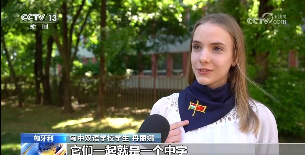 匈中雙語(yǔ)學(xué)校學(xué)生丹麗娜說(shuō):“我很開(kāi)心可以見(jiàn)到他們。我說(shuō),您好,我是匈中雙語(yǔ)學(xué)校的丹麗娜,歡迎來(lái)到匈牙利。這個(gè)領(lǐng)帶上可以看到匈牙利國(guó)旗和中國(guó)國(guó)旗,它們一起就是一個(gè)中字,這領(lǐng)帶代表兩個(gè)國(guó)家的友誼。我學(xué)了10年漢語(yǔ),將來(lái)這個(gè)語(yǔ)言會(huì)給我打開(kāi)很多工作的新門(mén)。”