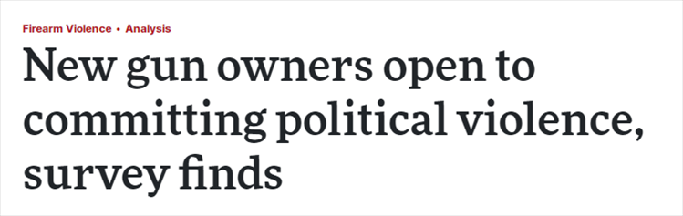 研究報(bào)告指出:“最近購(gòu)買(mǎi)槍支的人和幾乎總是攜帶槍支的人更有可能認(rèn)為政治暴力合理,并且更愿意參與其中,更愿意為實(shí)現(xiàn)政治目的而殺戮,也更愿意組建暴力團(tuán)體?!?/p>
