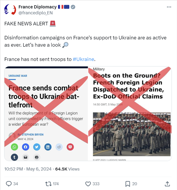 5月6日,法國(guó)外交部在X平臺(tái)上明確表示,“法國(guó)還沒(méi)有向?yàn)蹩颂m派兵?!?/p>