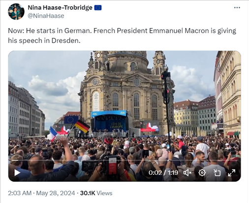 X平臺(tái)用戶@NinaHaase在28日凌晨2點(diǎn)03分發(fā)布的推文截圖,稱“現(xiàn)在,法國(guó)總統(tǒng)埃馬紐埃爾·馬克龍正在德累斯頓發(fā)表演講,他開(kāi)場(chǎng)用了德語(yǔ)”,沒(méi)有提到法國(guó)軍隊(duì)。