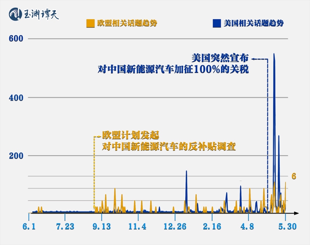 譚主分地區(qū)集納了過去一年外媒關(guān)于“對中國新能源汽車加征關(guān)稅”的報(bào)道,發(fā)現(xiàn)美國和歐洲地區(qū)出現(xiàn)了明顯的錯(cuò)峰: