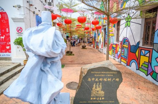 這是2019年12月20日在馬來西亞馬六甲拍攝的鄭和·朵云軒(馬六甲)藝術(shù)館外的馬中友好植樹廣場(chǎng)。600多年前,鄭和五次駐節(jié)馬六甲,由他帶到這片土地上的中華文化如今已深深融入當(dāng)?shù)囟嘣幕?。新華社記者朱煒攝