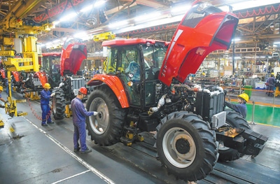 2024年5月,在位于河南洛陽市的中國(guó)一拖大拖公司總裝生產(chǎn)線上,工人正在裝配拖拉機(jī)。張怡熙攝(影像中國(guó))