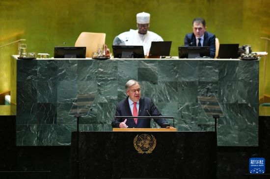 9月24日,在位于紐約的聯合國總部,聯合國秘書長古特雷斯(前)在第79屆聯合國大會一般性辯論開幕式上致辭。新華社記者 李睿 攝
