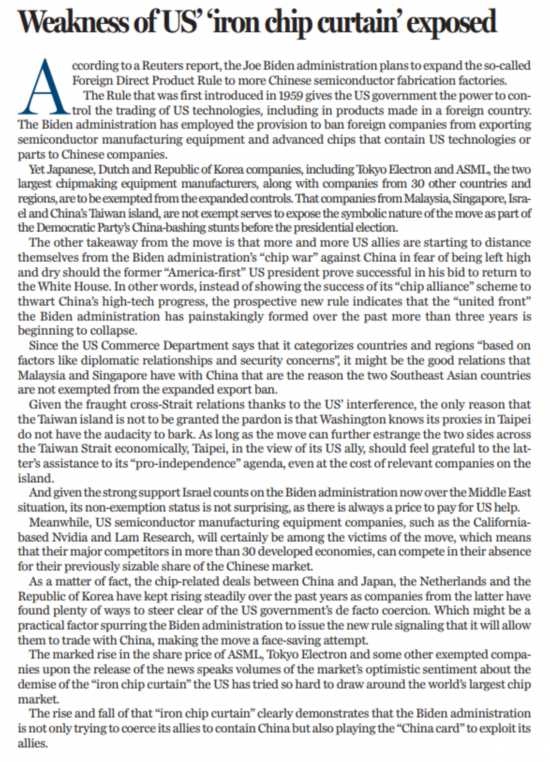 包括東京電子和阿斯麥兩大芯片設(shè)備制造商在內(nèi),來(lái)自日本、德國(guó)、韓國(guó)及其他30個(gè)國(guó)家和地區(qū)的相關(guān)企業(yè)將不會(huì)受到規(guī)則擴(kuò)大的影響,但馬來(lái)西亞、新加坡、以色列和中國(guó)臺(tái)灣的相關(guān)企業(yè)卻未被豁免。這表明擴(kuò)大規(guī)則范圍的象征意義遠(yuǎn)大于實(shí)際意義,實(shí)則是民主黨在美國(guó)總統(tǒng)大選到來(lái)之前抨擊中國(guó)的戲碼。