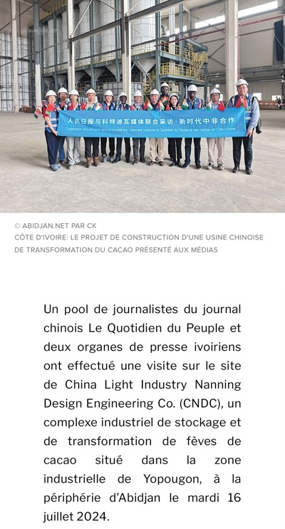 7月16日,人民日?qǐng)?bào)與兩家科特迪瓦新聞機(jī)構(gòu)記者一行參觀了由中國輕工業(yè)南寧設(shè)計(jì)工程有限公司總承包的可可加工及可可豆倉庫建設(shè)項(xiàng)目,該項(xiàng)目坐落在阿比讓郊區(qū)的約普貢工業(yè)區(qū)。該公司負(fù)責(zé)人指出,該項(xiàng)目綜合體計(jì)劃于2024年年底完工,包括一個(gè)可加工5萬噸可可豆的工廠、可存儲(chǔ)14萬噸可可豆的倉庫以及培訓(xùn)中心、行政大樓等?!钥铺氐贤甙⒈茸尵W(wǎng)報(bào)道