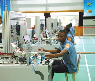 在第九屆非洲職業(yè)技能挑戰(zhàn)賽PLC賽區(qū),選手們專注于比賽。本報(bào)記者 張博嵐攝