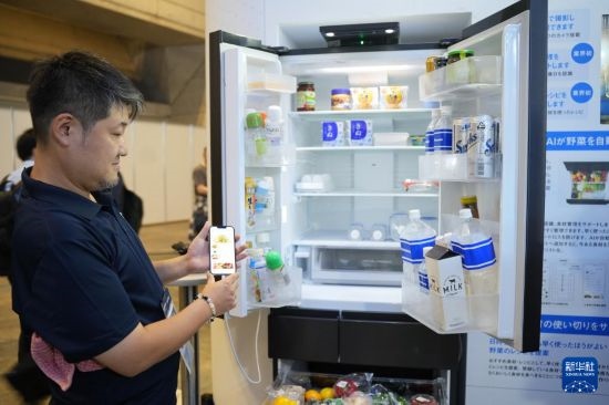 這是10月17日在日本千葉縣舉行的日本高新技術(shù)博覽會上拍攝的,日本松下公司展區(qū)搭載AI攝像頭的冰箱。新華社記者 錢錚 攝