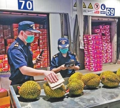 2024年8月1日,在廣西憑祥友誼關(guān)口岸海關(guān)查驗(yàn)平臺(tái),工作人員在查驗(yàn)一批進(jìn)口榴蓮。本報(bào)記者 牛 震攝