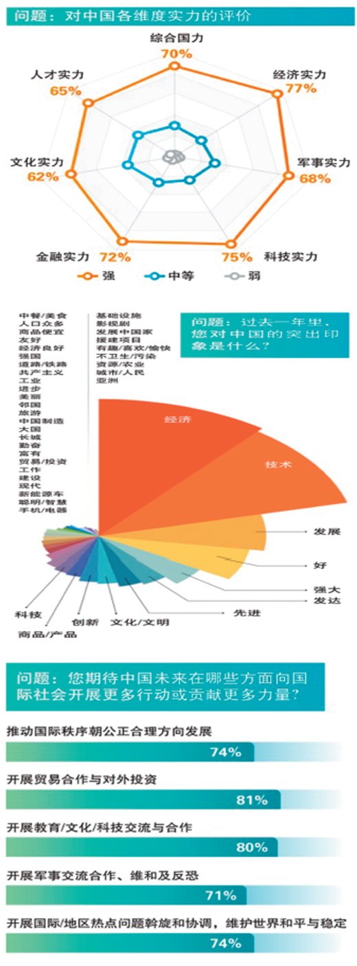 調查問卷讓被訪者自主描繪其過去一年里對中國的突出印象。報告顯示,各國民眾使用率最高的關鍵詞包括“經(jīng)濟”“技術/科技”“發(fā)展/發(fā)達”“好”“強大/強國”“先進/創(chuàng)新”“文化/文明”“商品/產(chǎn)品”“人口眾多”“中餐/美食”等。在發(fā)達國家、歐洲國家、中東國家和東盟國家,“經(jīng)濟”被提及的頻次居首;在發(fā)展中國家、非洲國家、金磚國家,“技術”被提及的頻次最高。