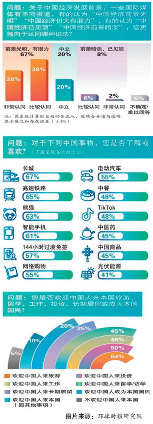 本次調查還列舉了10余項有代表性的中國事物,并逐一向國外民眾詢問喜愛與否。其中,長城(67%)、高鐵(65%)、熊貓(63%)、智能手機(61%)的獲喜愛比例超過六成,過境免簽(57%)、電動汽車(55%)和網(wǎng)絡購物(55%)的獲喜愛比例超過半數(shù),中餐(48%)和TikTok(48%)的獲喜愛比例接近半數(shù)。