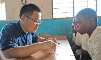 中國專家向姆坦噶尼小學(xué)學(xué)生講解血吸蟲病防治知識。
