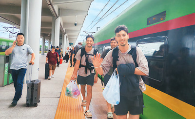外國(guó)旅客乘坐中老鐵路跨境旅客列車(chē)抵達(dá)云南磨憨站。