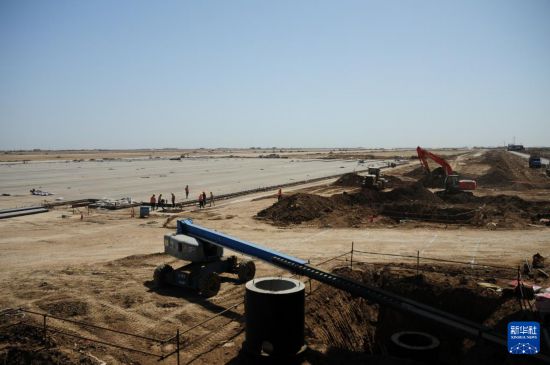 這是4月8日在伊拉克濟(jì)加爾省拍攝的由中國(guó)建筑集團(tuán)有限公司承建的納西里耶國(guó)際機(jī)場(chǎng)項(xiàng)目施工現(xiàn)場(chǎng)。新華社記者 段敏夫 攝
