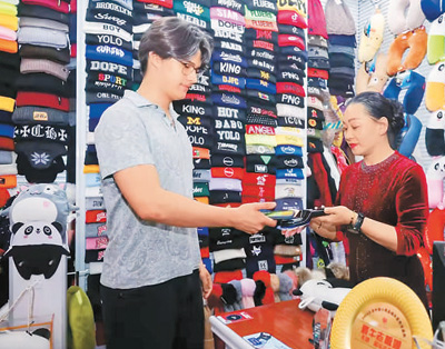 西班牙游客在浙江義烏國際商貿城用支付寶“碰一下”支付購物。