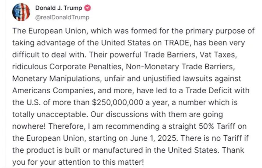 他說,美歐之間的磋商停滯不前?!耙虼耍医ㄗh自2025年6月1日起,對歐盟商品統(tǒng)一征收50%關(guān)稅。若產(chǎn)品在美國本土生產(chǎn)制造,則免征關(guān)稅?!?/p>