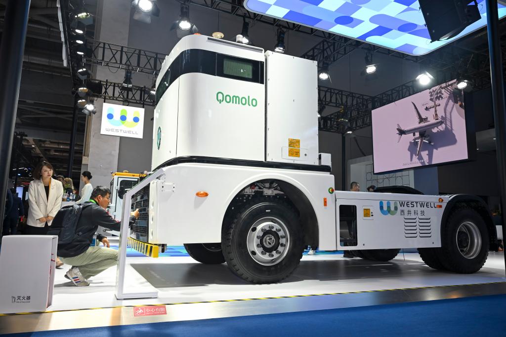 2025年11月6日,觀眾在第八屆進(jìn)博會(huì)汽車及智慧出行展區(qū)西井科技展臺(tái)拍攝展品Q-Truck全時(shí)無(wú)人駕駛集卡。新華社記者 陳浩明 攝