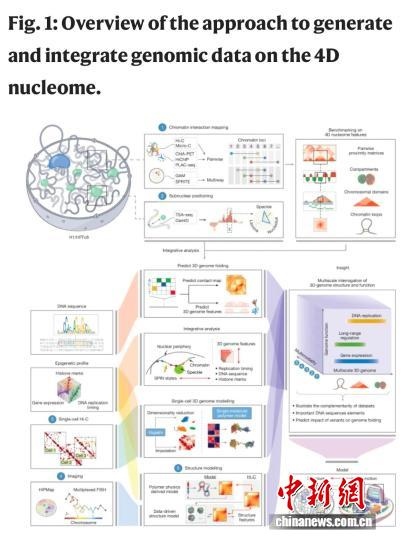 該論文介紹,人類染色體的三維組織結(jié)構(gòu),對于協(xié)調(diào)遺傳物質(zhì)調(diào)控生物反應(yīng)過程起到重要作用。DNA纏繞組蛋白形成名為染色質(zhì)的復(fù)合體,存儲在細(xì)胞核內(nèi)。大量染色質(zhì)位點(diǎn)可通過生物化學(xué)修飾來調(diào)控基因表達(dá)。繪制這一三維結(jié)構(gòu)及其如何經(jīng)時(shí)(第四維度)改變的工作,被稱為4D核組學(xué)。