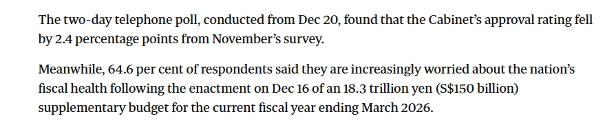 報道指出,目前進(jìn)口化石燃料占日本發(fā)電量的60%-70%,是推高通脹的主要因素之一,也已影響自民黨支持率。而日本共同社21日公布的最新民調(diào)顯示,高市早苗內(nèi)閣支持率較11月的調(diào)查下降了2.4個百分點,有64.6%的受訪者表示,隨著本月16日2025財年追加預(yù)算案的通過,他們對國家財政狀況的擔(dān)憂日益加劇。