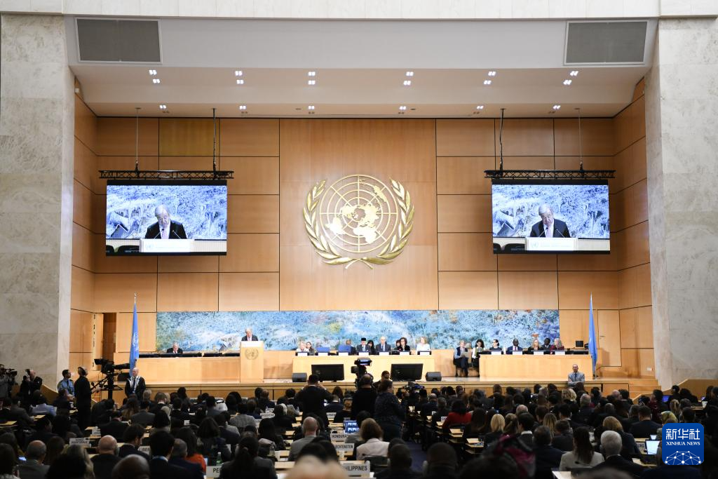 2月23日,在瑞士日內(nèi)瓦萬(wàn)國(guó)宮,聯(lián)合國(guó)秘書(shū)長(zhǎng)古特雷斯在聯(lián)合國(guó)人權(quán)理事會(huì)第61屆會(huì)議上講話。 新華社記者 連漪 攝