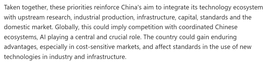 文章進一步分析說,這些優(yōu)先事項強化了中國將其技術(shù)生態(tài)系統(tǒng)與上游研究、工業(yè)生產(chǎn)、基礎(chǔ)設(shè)施、資本、標(biāo)準(zhǔn)及國內(nèi)市場相融合的目標(biāo)。對全球而言,這意味著未來將面對一個高度協(xié)同的中國技術(shù)生態(tài)系統(tǒng),而人工智能將是這一系統(tǒng)的中樞。中國由此可能獲得持久的競爭優(yōu)勢,同時也會在工業(yè)及基礎(chǔ)設(shè)施的新技術(shù)應(yīng)用標(biāo)準(zhǔn)方面發(fā)揮越來越大的影響力。