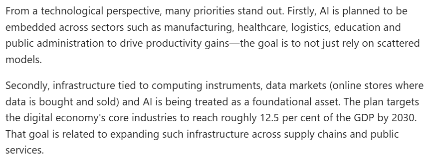 文章認(rèn)為,首先,人工智能被規(guī)劃融入制造業(yè)、醫(yī)療、物流、教育及公共管理等領(lǐng)域,以提升生產(chǎn)力,其目標(biāo)是不再局限于零散的應(yīng)用模式。其次,與計算設(shè)備、數(shù)據(jù)市場及人工智能相關(guān)的基礎(chǔ)設(shè)施,正被視作一種基礎(chǔ)性資產(chǎn)。規(guī)劃綱要提出,“十五五”時期數(shù)字經(jīng)濟核心產(chǎn)業(yè)增加值占國內(nèi)生產(chǎn)總值比重達到12.5%。這一目標(biāo)與在供應(yīng)鏈及公共服務(wù)領(lǐng)域擴展此類基礎(chǔ)設(shè)施密切相關(guān)。