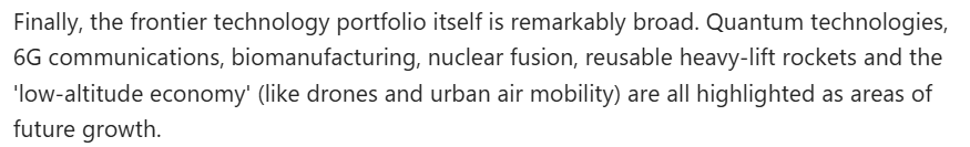 文章還注意到,當(dāng)前,中國繼續(xù)要求在科學(xué)技術(shù)等多個領(lǐng)域取得突破。這意味著,中國需要在整個技術(shù)體系層面構(gòu)建抗壓能力,而非依賴個別領(lǐng)域的孤立進展。此外,規(guī)劃綱要所涵蓋的前沿技術(shù)領(lǐng)域極為廣泛。量子技術(shù)、第六代移動通信技術(shù)、生物制造、核聚變、可復(fù)用重型運載火箭以及“低空經(jīng)濟”(包括無人機與城市空中交通)等,均被明確為未來發(fā)展的重點方向。