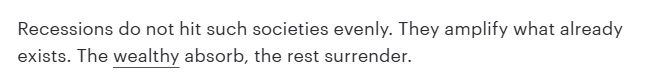 文章指出,經(jīng)濟(jì)衰退從來不會(huì)公平地影響整個(gè)社會(huì)。它只會(huì)加劇現(xiàn)有的社會(huì)分化:富人能夠化解危機(jī),而窮人只能舉手投降。
