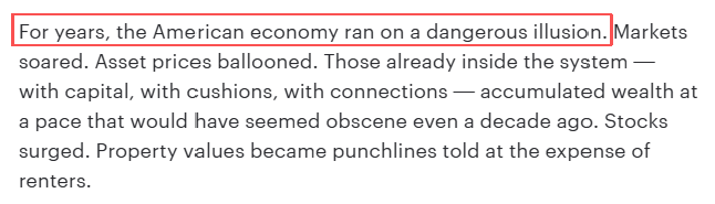 文章分析指出,美國經(jīng)濟(jì)多年來一直建立在危險(xiǎn)的幻覺之上。市場呈現(xiàn)虛假繁榮,資產(chǎn)價(jià)格不斷膨脹。那些掌握資本和人脈資源的既得利益者,正以驚人的速度積累財(cái)富。與此同時(shí),普通民眾卻要面對(duì)生活成本的持續(xù)攀升:食品價(jià)格從緩慢上漲到快速飆升,房租成為每月必須面對(duì)的生存考驗(yàn),信用卡從救急工具變成了新的債務(wù)陷阱。美國中產(chǎn)階級(jí)正面臨前所未有的生存壓力,階層滑落的風(fēng)險(xiǎn)遠(yuǎn)大于上升機(jī)會(huì)。