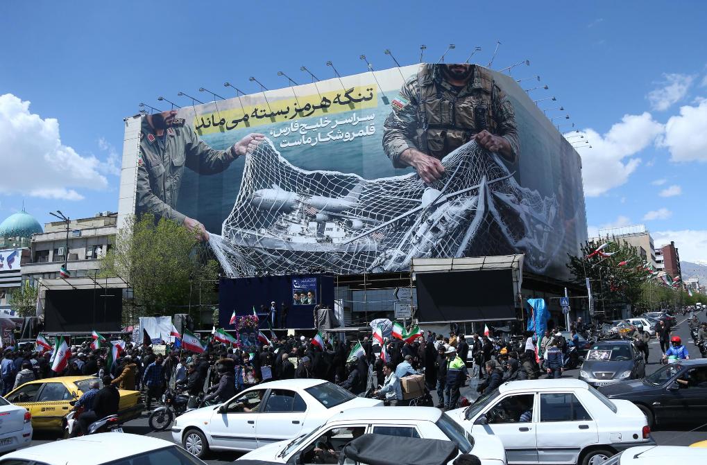 4月8日,民眾在伊朗首都德黑蘭革命廣場(chǎng)參加集會(huì)。廣場(chǎng)的大幅宣傳畫上描繪著伊朗武裝人員的形象,文字內(nèi)容是“霍爾木茲海峽仍然關(guān)閉 整個(gè)波斯灣都是我們的獵場(chǎng)”。新華社記者沙達(dá)提攝