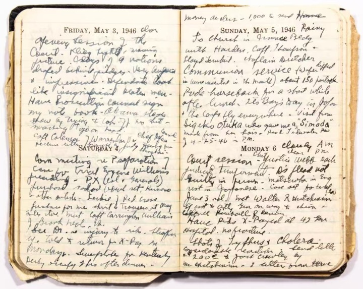 “星期六3月9日——我接到正式命令,前往上海、南京、北平及中國戰(zhàn)區(qū)其他地點,開展戰(zhàn)犯調(diào)查與證據(jù)收集工作?!薄靶瞧诙?月2日——上午11時20分抵達南京。”“星期五5月3日——東京審判首次開庭。被告席上的人顯得一派落魄,像是一群微不足道的敗者?!薄?本由薩頓親筆書寫的日記,記錄了1946年至1948年他執(zhí)行東京審判任務期間的諸多細節(jié),是南京大屠殺檔案的重大發(fā)現(xiàn)。
