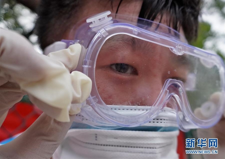 豐臺區(qū)東高地街道社區(qū)衛(wèi)生服務中心一位醫(yī)護人員的護目鏡內(nèi)流進了汗水(6月15日攝)。連日來,北京出現(xiàn)高溫天氣??崾钪?,工作人員堅守抗擊疫情一線,成為烈日下的“逆行者”。新華社記者李欣攝