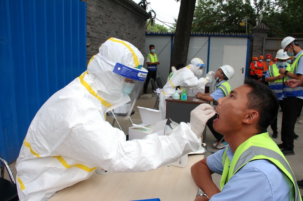 6月17日,在中建三局北京公司北京東城區(qū)一項(xiàng)目工地,工人接受核酸檢測(cè)。