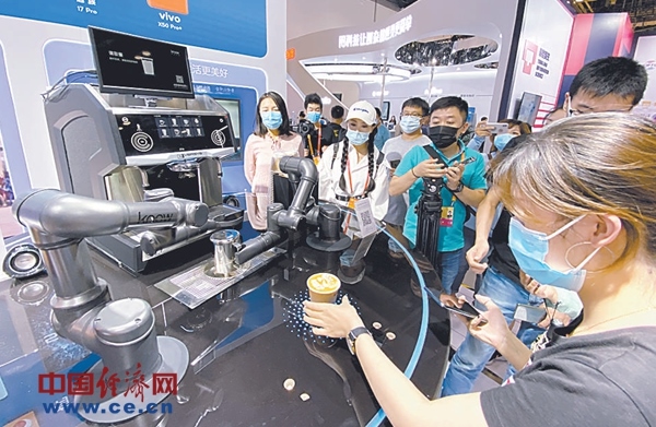在綜合展區(qū)高通展臺,觀眾們排隊體驗機器人制作的拉花咖啡。經濟日報-中國經濟網記者袁勇攝