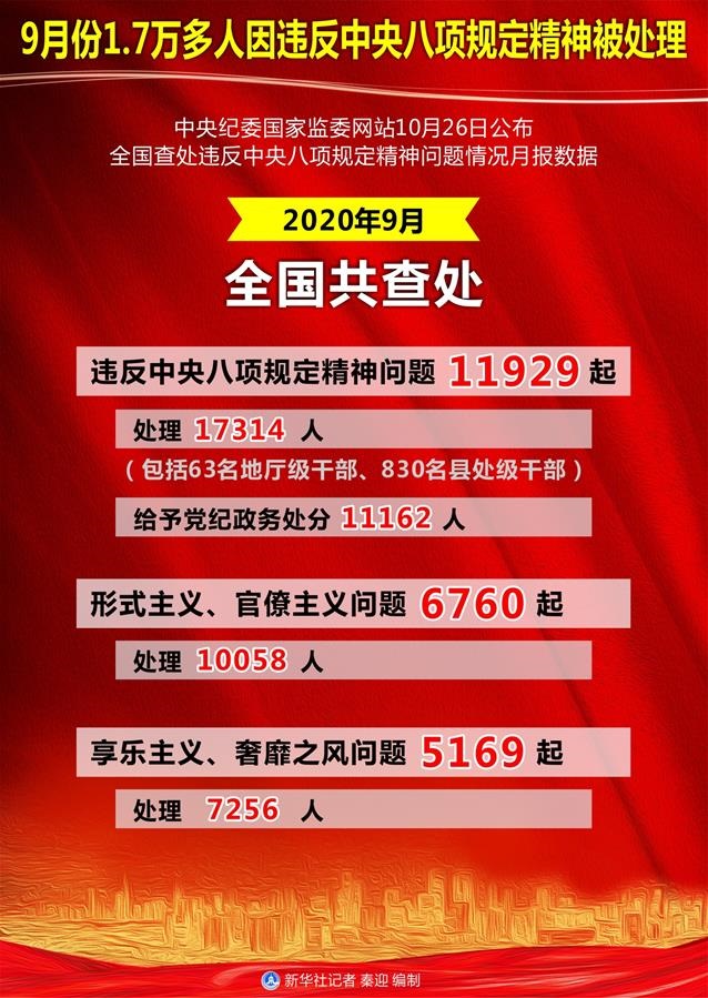新華社北京10月26日電(記者朱基釵、孫少龍)中央紀委國家監(jiān)委網(wǎng)站26日公布全國查處違反中央八項規(guī)定精神問題情況月報數(shù)據(jù)。通報顯示,2020年9月,全國共查處違反中央八項規(guī)定精神問題11929起,處理17314人(包括63名地廳級干部、830名縣處級干部),給予黨紀政務處分11162人。